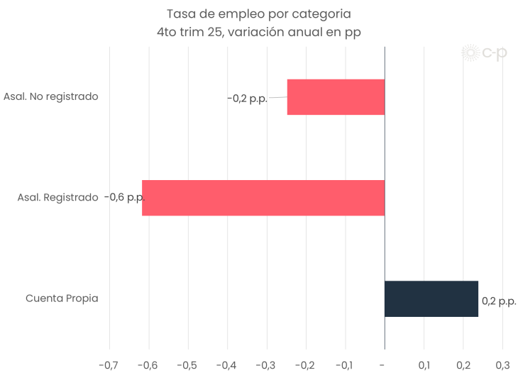Mientras los asalariados registrados disminuyeron 0,6 p.p. y los asalariados no registrados 0,2 p.p, los trabajadores por cuenta propia aumentaron 0,2 p.p., sin llegar a compensar las caídas en las otras modalidades.
