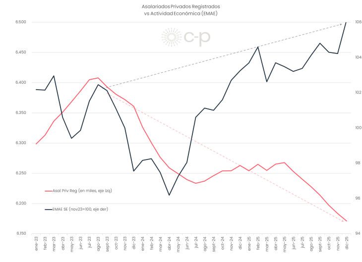 En suma, Pastrana señala que "Los indicadores del mercado de trabajo muestran un empeoramiento a fines de 2025" que "se suma a la ya delicada situación de los ingresos debido a la caída en los salarios reales y jubilaciones en el marco de la aceleración inflacionaria".