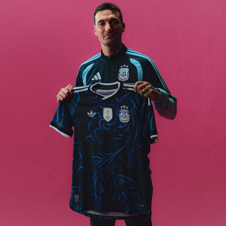 El elemento central de la prenda es un gráfico de espirales en tonos azules y morados que recorre el frente, inspirado en las hojas de laurel del escudo nacional y en el arte del fileteado porteño. Además, la camiseta funciona como un tributo a la cultura y la historia del fútbol nacional: escudo monocromático, parche de campeón del mundo y en el dorso se ubica el icónico Sol de Mayo, acompañado por la inscripción "Argentina" y una bandera nacional diseñadas bajo la estética del fileteado porteño.
