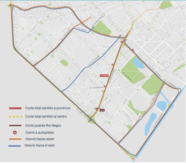 Según el diagrama establecido por el Ministero de Movilidad e Infraestructura de la Ciudad de Buenos Aires, el tránsito que llegue por AU 25 de Mayo con destino a Ezeiza será desviado por AU Perito Moreno – Av. General Paz – Riccheri. Se podrá evitar la autopista utilizando Av. Independencia – Alberdi – General Paz. En tanto que mano al centro, el corte será entre Av. General Paz y Av. Argentina, permitiendo que se pueda acceder a la autopista en las subidas de Av. Argentina o Av. Escalada para empalmar con AU 25 de Mayo.