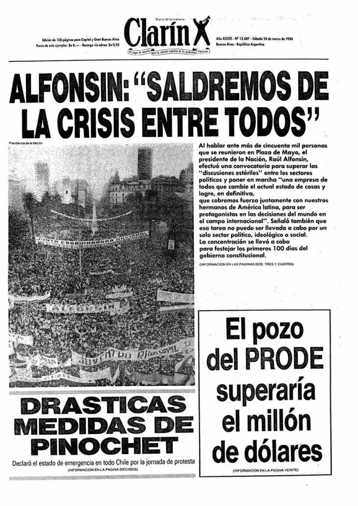 El 24 de marzo de 1984 fue el primero desde la recuperación de la democracia y conicidió con los primeros cien dìas de gobierno de Raúl Alfonsín. Lejos del tono que la fecha tuvo en los años anteriores, hubo una fiesta popular en Plaza de Mayo. Al cierre de la jornada, el presidente se dirigió a la multitud para trazar un diagnòstico de la situación del país luego de siete años de dictadura. Al año siguiente comenzó el juicio a las juntas militares, que terminó en condenas para varios de los jerarcas de la dictadura.
