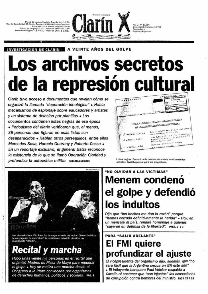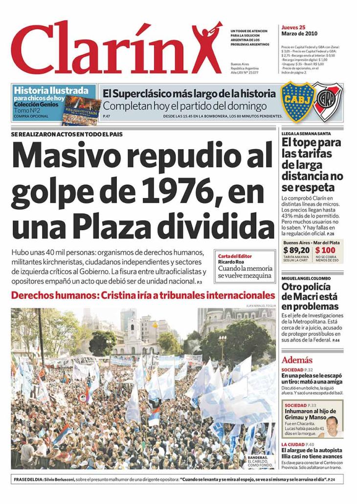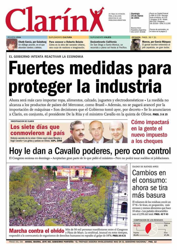 El 24 de marzo de 2001 se cumplieron veiticinco años del golpe. El país atravesaba una profunda crisis económica, pero ese sábado la Plaza de Mayo se llenó de gente que concurrió para expresar su repudio a la dictadura. La preocupación del gobierno era la economía.Hacía cinco días que el presidente Fernando De la Rúa había convocado a Domingo Cavallo para intentar una salida.
