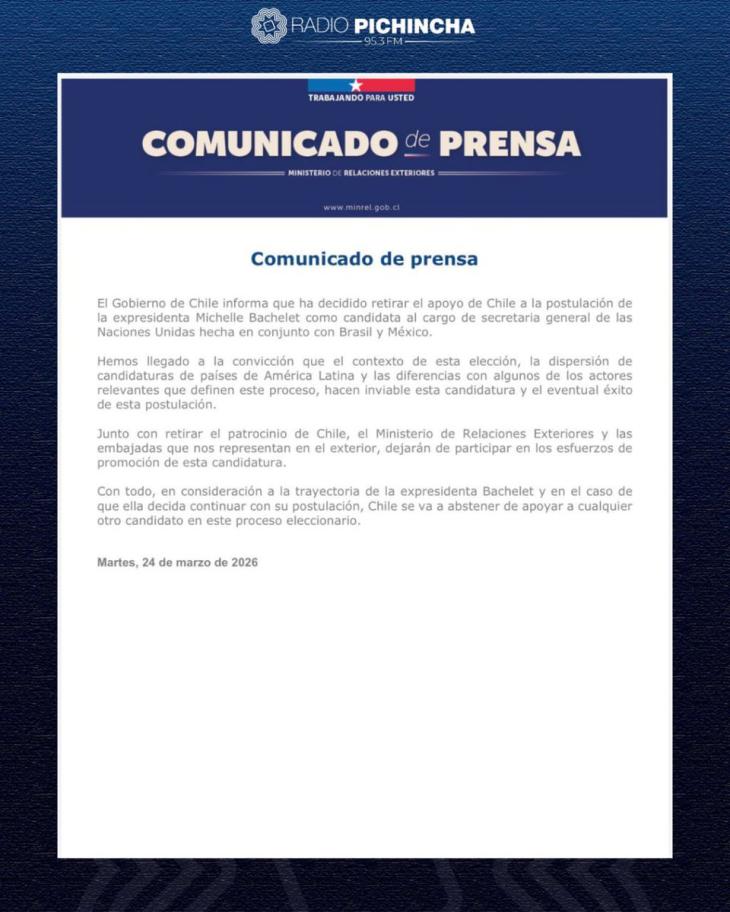 La decisión del gobierno de Chile de retirar el apoyo a la candidatura de Michelle Bachelet a la Secretaría General de la ONU marca un giro claro hacia una política exterior basada en criterios de viabilidad y no en capital simbólico. En un escenario internacional altamente competitivo, donde el respaldo de las potencias y la cohesión regional son determinantes, insistir en una candidatura debilitada implicaba un costo innecesario para el país.
