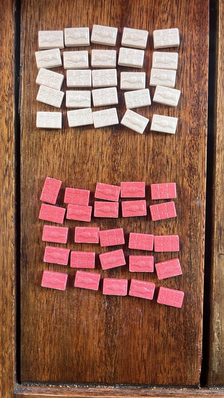 Una vez reducidos, los agentes procedieron a identificarlos y, en presencia de testigos, realizaron la requisa. En ese contexto, dentro de un bolso hallaron 37 frascos plásticos que contenían flores de marihuana, con un peso total de 241,8 gramos. Además, incautaron 50 pastillas de éxtasis y dos teléfonos celulares.