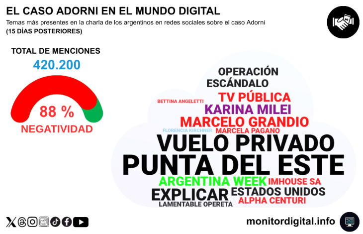En términos de volumen, el caso $LIBRA fue el más expansivo dentro del ciclo libertario, mientras que ANDIS se destacó por ser el más negativizado. En ese escenario, el denominado “Adornigate” queda en un tercer escalón, tanto en alcance como en nivel de rechazo.