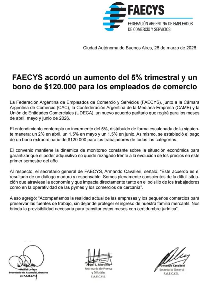 El titular del gremio de comercio, Armando Cavalieri, destacó que “este acuerdo es el resultado de un diálogo maduro y responsable. Somos plenamente conscientes de la difícil situación que atraviesa la economía y que impacta directamente tanto en el bolsillo de los trabajadores como en la operatividad de las pymes y los comercios de cercanía”.
