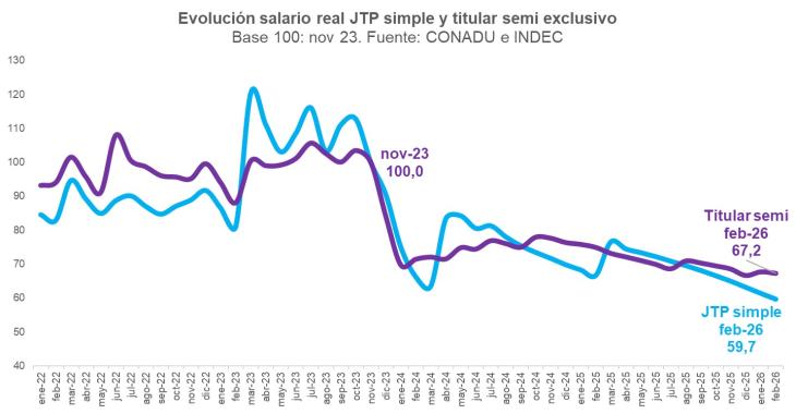 Entre 2023 y 2026, el grueso del ajuste recayó sobre el personal docente y no docente: los salarios se redujeron 43,2% en términos reales.