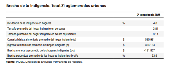 En el segundo semestre de 2025, en promedio, la línea de indigencia de los hogares argentinos era de $535.991, mientras que los ingresos fueron de $354.134.