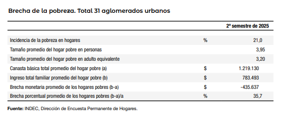 En el segundo semestre de 2025, el 21% de los hogares del país, en el que vive el 28,2% de los argentinos, no alcanzaba a cubrir la CBT. Es decir, se encontraba en situación de pobreza.