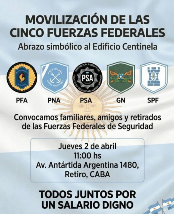 En los últimos días, distintos sectores señalaron que los salarios habían quedado rezagados respecto del costo de vida, lo que generó tensiones internas y pedidos de recomposición. Tal es así que para este jueves 2 de abril está contemplada una manifestación para visibilizar el enojo. Es convocada por las cinco fuerzas de seguridad: Prefectura, Gendarmería, Policía de Seguridad Aeroportuaria, Servicio Penitenciario Federal y Policía Federal. Consistirá en un abrazo solidario en el edificio Centinela de Retiro, sede de la Gendarmería.