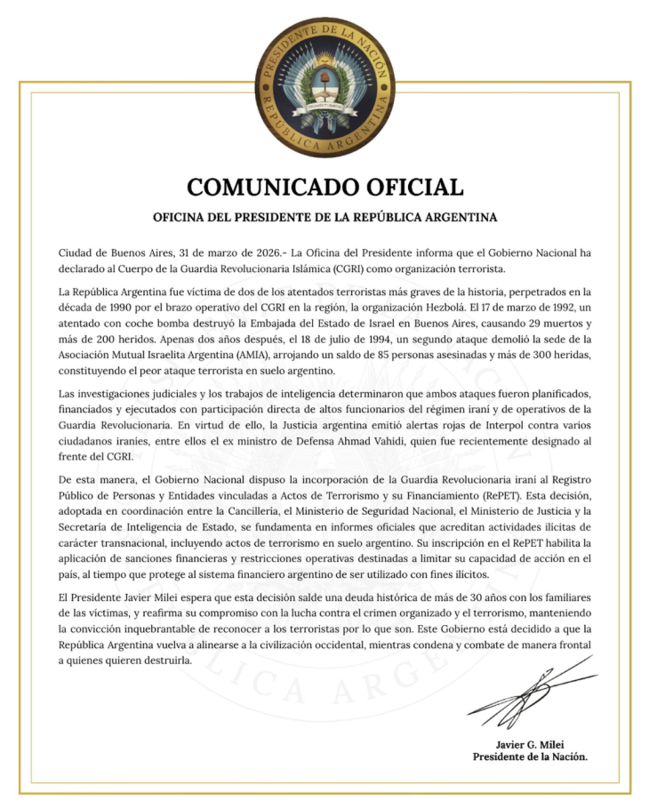 La decisión del Gobierno argentino de declarar a la Guardia Revolucionaria Islámica de Irán (CGRI) como organización terrorista marca un punto de inflexión en la política de seguridad nacional. Lejos de tratarse de un gesto simbólico, la medida se apoya en antecedentes judiciales y en una narrativa histórica vinculada a los atentados que golpearon al país en la década de 1990. En este contexto, la decisión se presenta como un intento de saldar una deuda pendiente con las víctimas y sus familias.