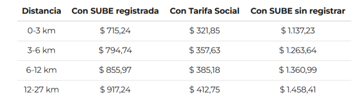 Por su parte, para quienes no cuentan con SUBE registrada, los valores del boleto quedaron establecidos en $1.137,23 para 0 a 3 kilómetros, $1.263,64 para 3 a 6 kilómetros, $1.360,99 para 6 a 12 kilómetros y $1.458,41 para 12 a 27 kilómetros.