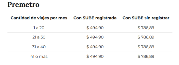 En el caso del premetro, para quienes cuentan con tarjeta SUBE registrada, el boleto sale a partir de este 1º de abril $494,90, mientras que quienes no tengan la SUBE registrada, abonarán el pasaje $786,89.