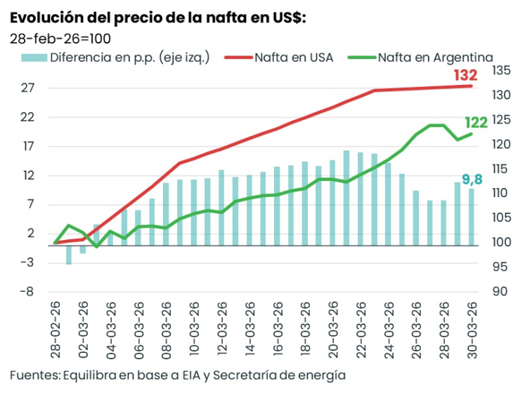 El economista Lorenzo Sigaut Gravina, de la consultora Equilibra, indicó que, en dólares, el precio de la nafta local subió 22% desde el comienzo de la guerra, mientras que, en Estados Unidos, la suba fue de 32%.