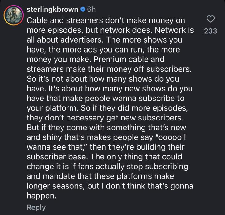 Según Brown, la clave reside en la fuente de ingresos de cada medio. Mientras que las cadenas de televisión abierta dependen de los anunciantes, los servicios de streaming y el cable premium se rigen por el volumen de suscriptores. "Las cadenas y el streaming no ganan dinero con más episodios, pero la televisión abierta sí. La televisión abierta se trata de los anunciantes", señaló el actor, aclarando que, en el modelo antiguo, tener más contenido permitía emitir más publicidad y, por ende, generar mayores ganancias directas.