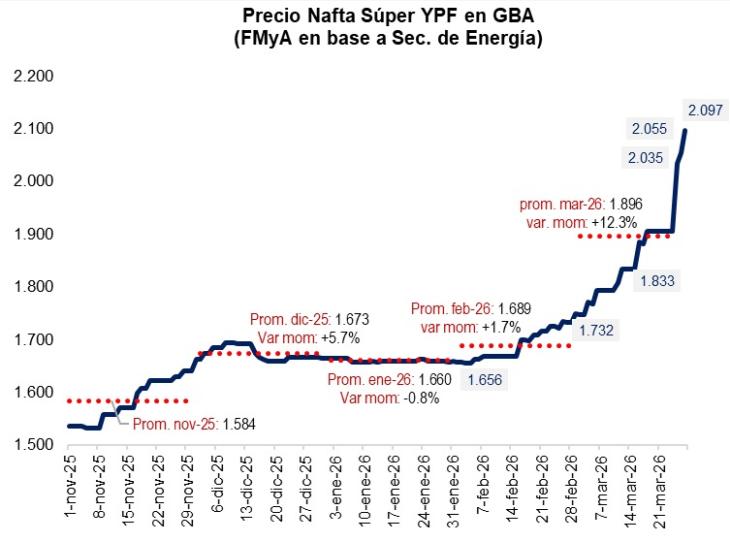 La medida llega a un mes de iniciada la guerra, luego de que el precio de la nafta en surtidor promedió una suba de 12,3% respecto a febrero. El 28 de marzo, la súper trepó a $2.097 en el GBA, según el economista Fernando Marull.