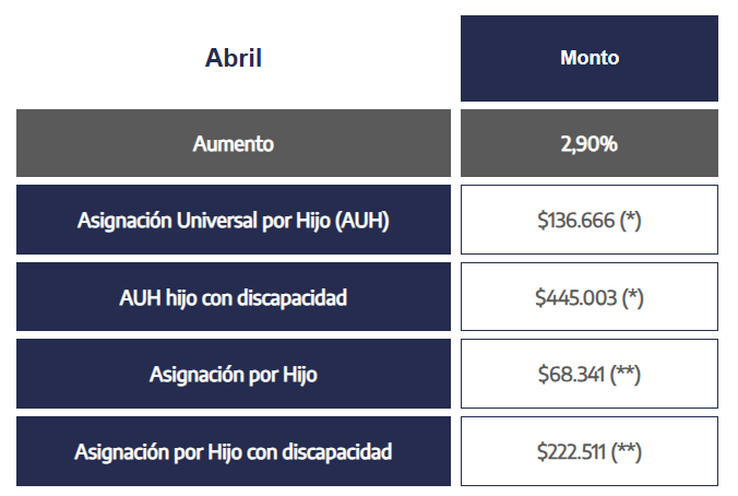 La AUH será en el cuarto mes del año de $136.666. Por su parte, la Asignación Universal por Hijo con Discapacidad asciende a $445.003.