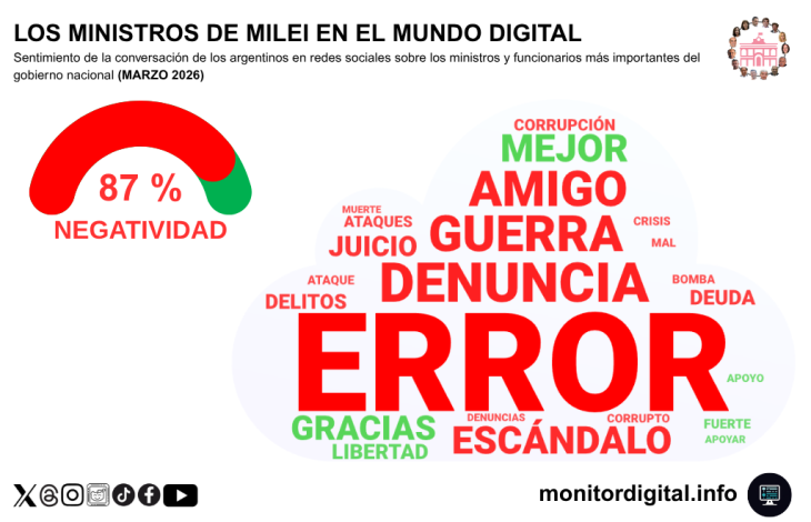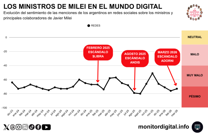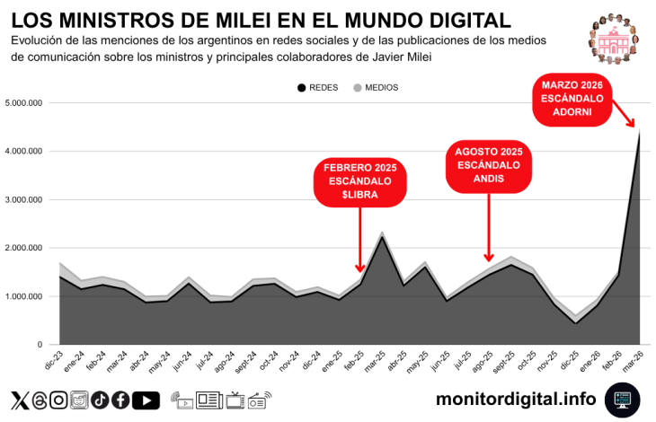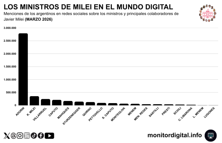 El estallido del denominado “Adornigate” alteró de manera brusca la agenda digital del oficialismo y convirtió a Manuel Adorni en el centro casi excluyente de la conversación pública. Redes sociales y medios de comunicación se movieron en espejo y amplificaron el episodio hasta niveles inéditos, según el último informe de Monitor Digital, que ubicó a marzo de 2026 como el mes con mayor volumen de menciones sobre el gabinete de Javier Milei.