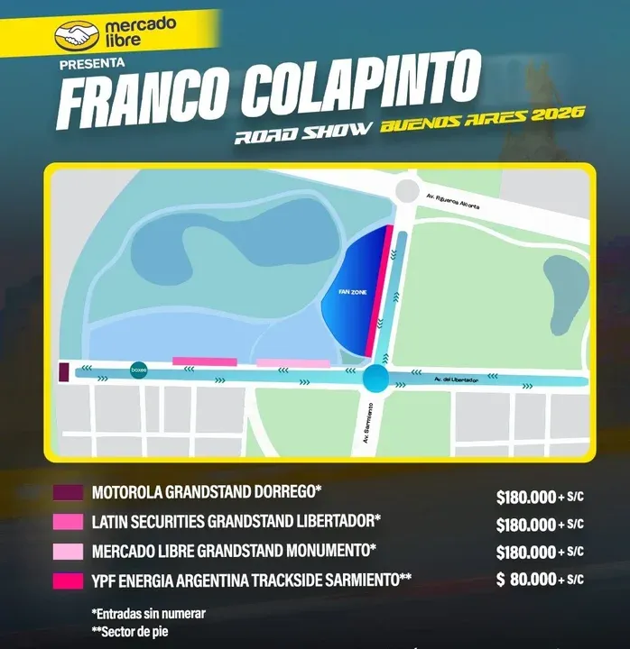 Las entradas no incluyen el costo de servicio, pero sí contemplan el acceso al Fan Zone y a los espacios gastronómicos del evento. Se espera una gran convocatoria para este espectáculo único, que tendrá a Colapinto como figura central en un show pensado para acercar el automovilismo de elite al público argentino.
