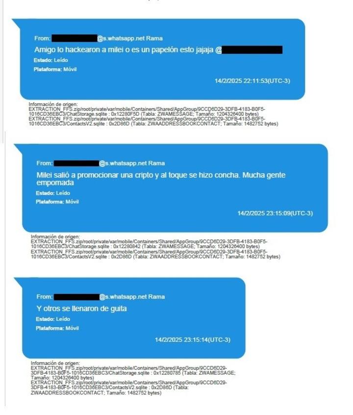 La defensa cuestionó que el peritaje haya excedido los criterios fijados originalmente y que se hayan incorporado chats personales sin relación directa con la investigación, incluso de años anteriores al surgimiento del criptoactivo.