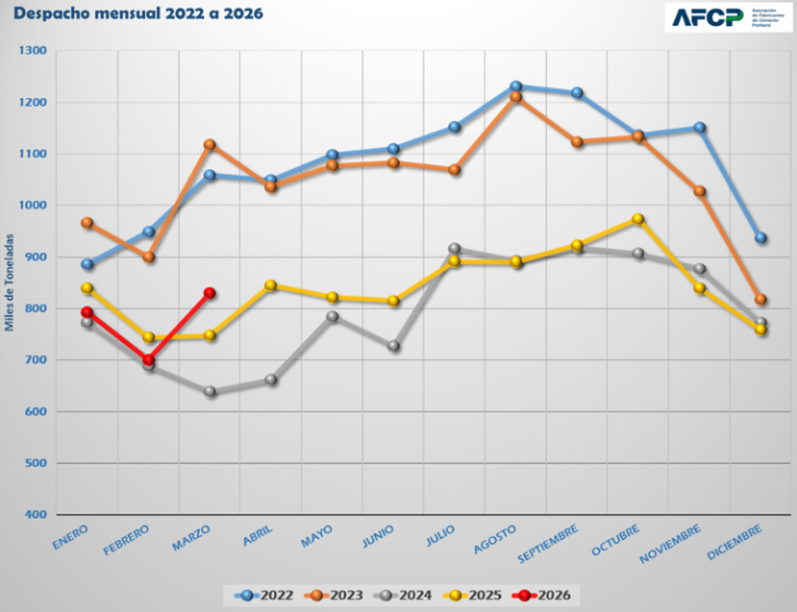 Aún con la recuperación mostrada, en el tercer mes de 2026, se despachó 26% menos de cemento que en 2023.