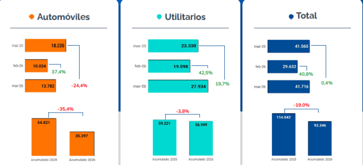 La caída fue más pronunciada en utilitarios (-30,9%), con solo 11.354 unidades vendidas, que en automóviles (-4,4%), con 30.099 unidades comercializadas.