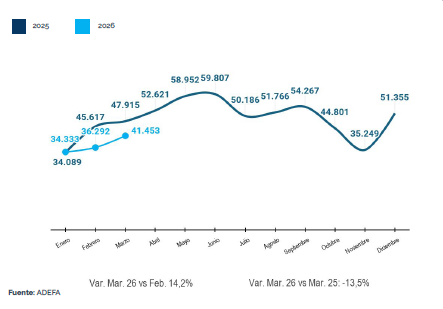 En cuanto a comercialización a la red de concesionarios, se vendieron 41.453 vehículos en marzo, 13,5% por debajo del volumen del mismo mes de 2025.