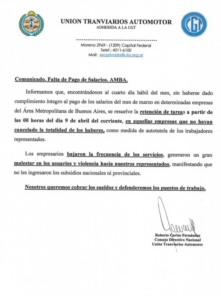 La empresa Metropol indicó ayer a última hora que:"hemos abonado el 100% de los salarios de la totalidad de nuestro personal. En consecuencia, no se registrarán medidas de abstención de tareas por parte de los conductores y los servicios se prestarán conforme a los diagramas habituales".