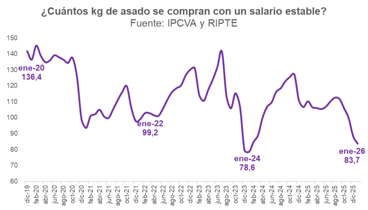 Entre el aumento de precios del asado y el retraso de los salarios, la relación entre ambos indicadores se encuentra cerca de su peor nivel. En enero de 2026, con un salario estable se compraban sólo 83,7 kilogramos de asado.