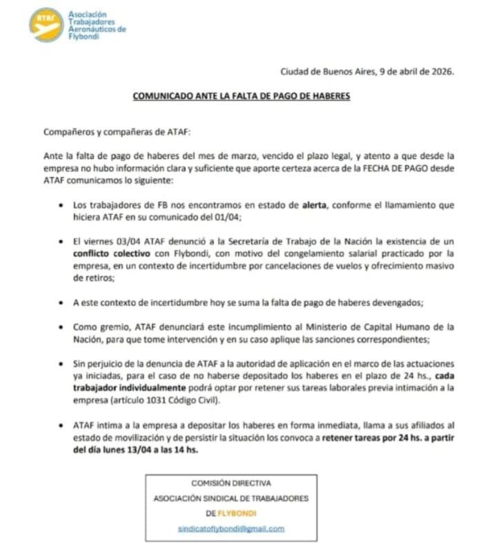 En las últimas horas, los empleados se declararon en estado de alerta y el sindicato ATAF (Asociación de Trabajadores Aeronáuticos de Flybondi) avanzó con una denuncia formal ante la Secretaría de Trabajo.