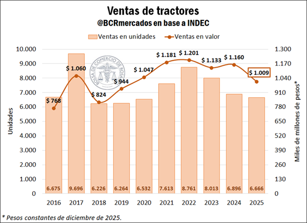 Las ventas de tractores totalizaron 6.666 unidades, lo que implicó una caída de 3% respecto al año anterior y de 12% frente al promedio de los últimos cinco años. En términos de valor, la facturación alcanzó 1 billón de pesos, con una disminución real de 13% interanual, en un contexto de caída de 10% en el precio unitario real.