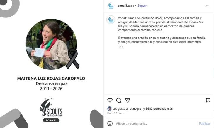 El grupo de scouts “Zona 11”, al que también asistía Maitena, tampoco salió de su tristeza al enterarse de la noticia. En este sentido, expresó su dolor a través de un mensaje difundido en su cuenta de Instagram. “Con profundo dolor, acompañamos a la familia y amigos de Maitena ante su partida al Campamento Eterno”, inicia el texto difundido por la organización sin fines de lucro en la red social Instagram.