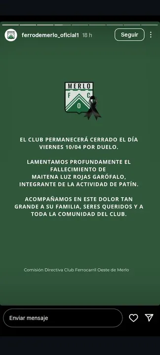 Por su parte, la Comisión Directiva del club Ferrocarril Oeste de Merlo, donde la adolescente practicaba patín, también se expresó sobre el deceso: “Lamentamos profundamente el fallecimiento de Maitena. Acompañamos en este dolor tan grande a su familia, seres queridos y la comunidad del club”. En este contexto, la institución deportiva permaneció cerrado por duelo.