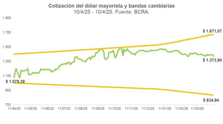 El 11 de abril de 2025, el dólar minorista se comercializó en promedio a $1.078,4. Un año después, el tipo de cambio aumentó 27% y se ubica en $1.373,9.