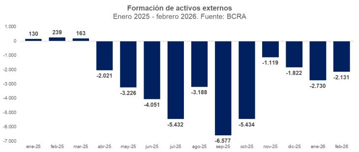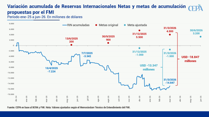 Según los criterios establecidos por el FMI en el acuerdo 2025, las reservas netas debían ubicarse, a marzo de 2026, USD 1.500 millones por debajo de diciembre de 2024. Sin embargo, el BCRA perdió constantemente divisas, hasta situarse USD 14.500 millones por debajo.
