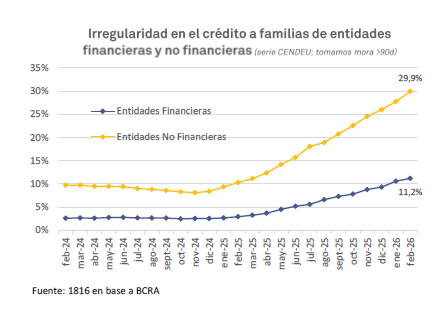 En el segmento de entidades no financieras, la mora de los hogares ya alcanzó el 29,9% en febrero, con un salto de más de dos puntos en un solo mes. Este segmento representa cerca del 17% del total de préstamos a familias.