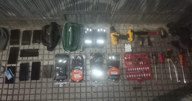 Durante el procedimiento, se secuestraron dos notebooks, ocho teléfonos celulares, guantes, herramientas de corte y fuerza —entre ellas un taladro, pinzas, destornilladores, un cortafierro y una barreta— además de bolsos y riñoneras.