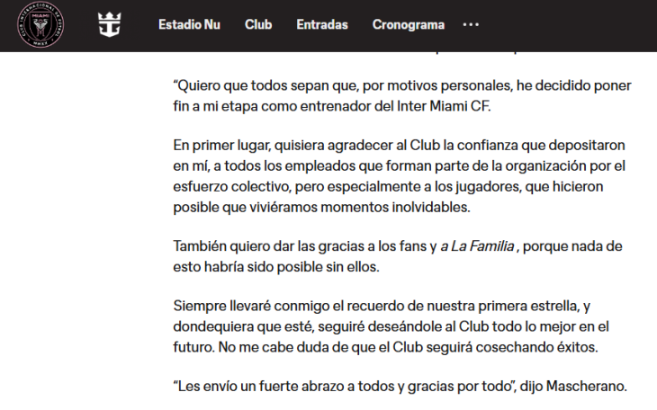Mascherano, de 41 años, explicó que su salida responde a motivos personales, sin dar mayores precisiones. En su despedida, agradeció al cuerpo técnico, jugadores y aficionados por el apoyo recibido durante su gestión. “Me llevo recuerdos imborrables y el orgullo de haber sido parte de este capítulo histórico”, expresó el exmediocampista en declaraciones reproducidas por medios locales.