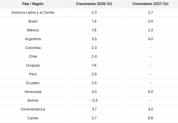 En América Latina, el crecimiento proyectado es de 2,3%, mientras que a nivel global se espera una expansión del 3,1%, en un contexto más incierto por el conflicto internacional.