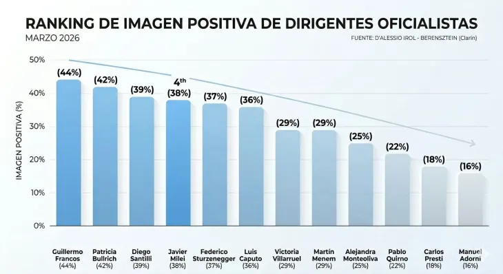 En el ranking de imagen oficialista, el Presidente figura en el cuarto lugar con un 38%, por debajo de figuras como Patricia Bullrich y el exjefe de gabinete Guillermo Francos. El dato más crítico lo arroja la imagen de Manuel Adorni, quien se ubica en el último lugar de la tabla con apenas un 16% de aceptación general.