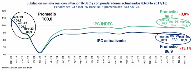 Según el informe del CEPA, las jubilaciones mínimas perdieron 3,8% en términos reales en el primer trimestre de 2026 contra el último trimestre de 2023. Pero si se toma una medición con canasta actualizada al 2017/2018 la caída es mucho mayor:-13,1% de poder adquisitivo