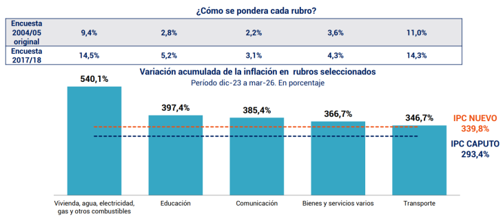 La comparación entre la canasta original de 2004/05 y la encuesta 2017/18 muestra que varios rubros ganan participación de forma significativa. Por ejemplo: Vivienda, agua, electricidad, gas y otros combustibles pasa de 9,4% a 14,5%, Educación sube de 2,8% a 5,2%, Comunicación pasa de 2,2% a 3,1%, Bienes y servicios varios crece de 3,6% a 4,3% y Transporte sube de 11% a 14,3%