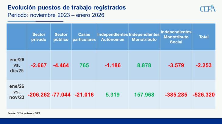 El único segmento que muestra una leve mejora es el trabajo en casas particulares, que empezó a recuperarse desde el tercer trimestre de 2025. Sin embargo, sigue lejos de los niveles previos a la pandemia y acumula: -21.016 puestos desde el inicio de la gestión (-4,5%)