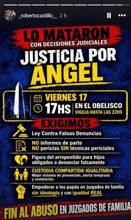 La cita tendrá lugar en el Obelisco a partir de las 17 horas y se extenderá hasta las 22. Durante la vigilia, se difundirán consignas contra el actual funcionamiento de los juzgados de familia. El lema principal de la jornada será "Justicia por Ángel" y "Fin al abuso" en los Juzgados de Familia.