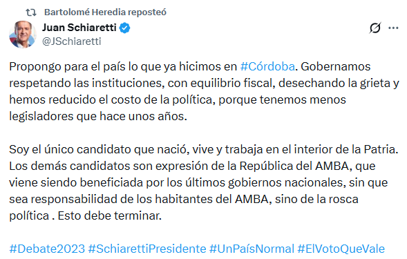 Más allá de su perfil técnico, Heredia también mostró su apoyo a Juan Schiaretti durante la campaña presidencial de 2023. En ese período, replicó en redes sociales mensajes del entonces candidato, en los que se planteaban críticas tanto al oficialismo como a la oposición tradicional.