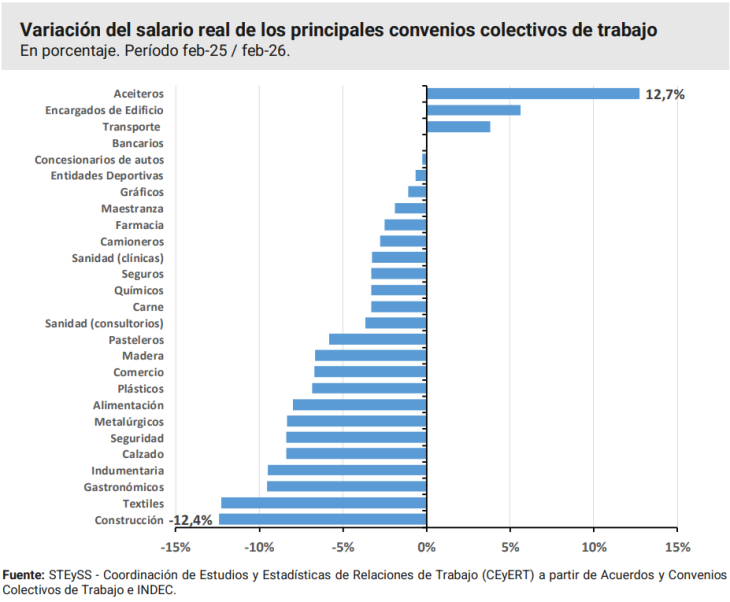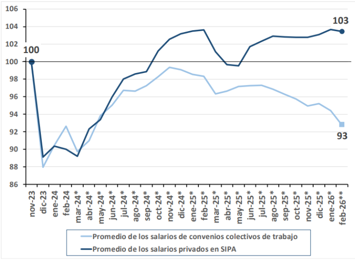 El dato más relevante aparece en la comparación anual: los salarios de convenio acumulan una caída real de 5,9% entre febrero de 2025 y febrero de 2026.