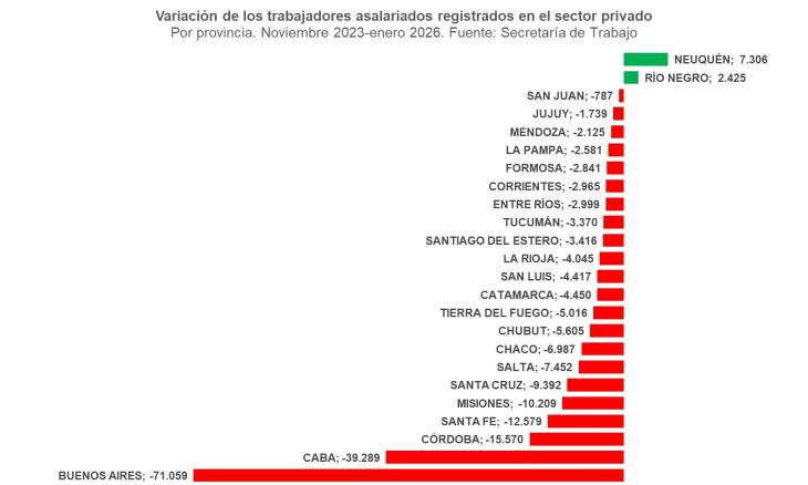 Desde noviembre de 2023, sólo 2 jurisdicciones lograron incrementar el empleo asalariado privado. En Neuquén se crearon 7.306 puestos, seguido de Río Negro (+2.425). Representan un crecimiento del 5,1% y 2,2% respectivamente.