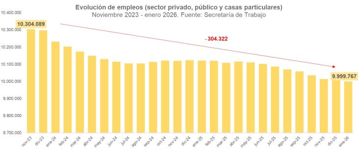 En total, la caída del empleo asalariado registrado alcanza 304.322 puestos de trabajo desde el cambio de gobierno. El descenso del último mes llevó a los puestos asalariados a romper la barrera de los 10 millones, ubicándose en 9.999.767. Se marca así un retroceso de 4 años: desde junio de 2022 los asalariados superaban los 10 millones.