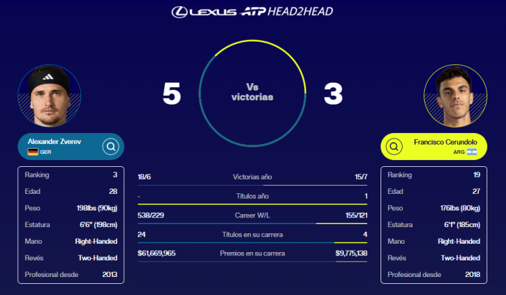 Con esta victoria, Zverev estiró su ventaja en el historial frente a Cerúndolo a 5-3. Es la primera vez que logra vencerlo en polvo de ladrillo, superficie en la que el argentino había ganado los tres duelos previos. El triunfo también significó la quinta victoria consecutiva de Zverev sobre Cerúndolo en los últimos ocho meses, consolidando su dominio en la rivalidad y cortando la racha negativa que tenía en arcilla ante el argentino.