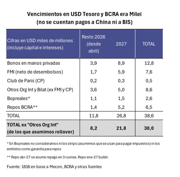 Argentina enfrenta en lo que resta de este año vencimientos por USD 11.800 millones, que se reducen a USD 8.200 millones dando por sentado el refinanciamiento de organismos internacionales (excepto FMI y Club de París), de acuerdo a las estimaciones de la Consultora 1816.